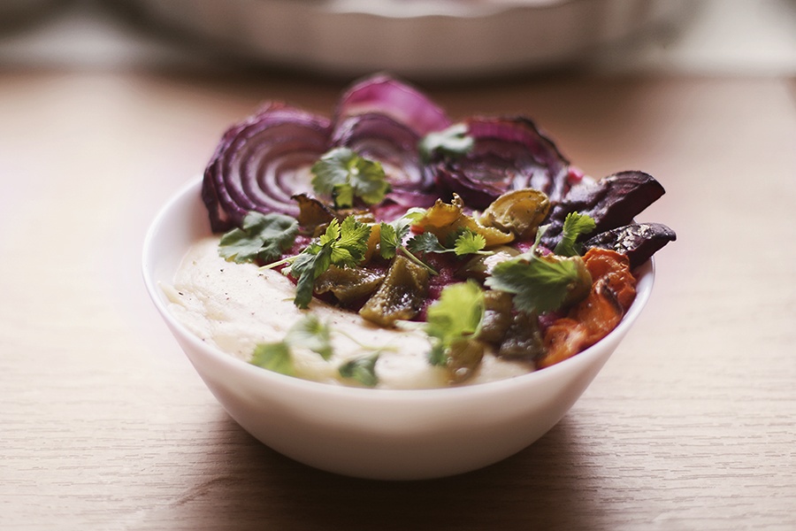 pieczona czerwona cebula, zielona papryka, marchew, burak, kolendra